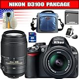 Nikon's affordable, compact and lightweight D3100 digital SLR features a high-resolution 14 Megapixel CMOS DX sensor, high-quality 3x NIKKOR 18-55mm VR image stabilization zoom lens and intuitive onboard assistance including the learn-as-you grow Guide Mode. Capture beautiful pictures and amazing Full HD 1080p movies with sound and full-time autofocus. Easily capture the action other cameras miss with a fast start up time, split-second shutter release, 3 frames per second shooting and 11-point autofocus. Capture pictures and make movies in near darkness with an ISO range of 100 to 3200 (expandable to 12800-Hi2).EXPEED 2, Nikon's new image processing engine, assures breathtakingly rich image quality, managing color, contrast, exposure and noise. One-touch Live View and movie recording lets you see the action on the 3-inch monitor and the Scene Recognition System automatically chooses the ideal settings. You can also select from 6 Automatic Exposure Scene Modes- Portrait, Landscape, Child, Sports, Close-up or Night Portrait for stunning results in otherwise challenging conditions. Active D-Lighting restores picture-enhancing detail in shadows and highlights. A built-in pop-up flash is ready for those times when there just isn't enough light and in-camera image editing allows creative freedom and effects, without the need for a computer.Package Includes:*Nikon D3100 Kit w/18-55mm VRNikon 55-300mm VR*Universal Screen Protectors*4 in 1 Cleaning Kit*Xplorer Vista 90 DSLR Case*8GB Memory Card*USB 2.0 SDHC Memory Card Reader