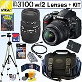 Nikon's compact and lightweight D3100 digital SLR features a high-resolution 14-megapixel CMOS DX sensor and intuitive onboard assistance. Capture beautiful pictures and amazing Full HD 1080p movies with sound and full-time autofocus.Easily capture the action with a fast start up time, split-second shutter release, 3 frames per second shooting and 11-point autofocus. Capture pictures and make movies in near darkness with an ISO range of 100 to 3200 (expandable to 12800-Hi2). EXPEED 2, Nikon's new image processing engine, assures breathtakingly rich image quality, managing color, contrast, exposure and noise. One-touch Live View and movie recording lets you see the action on the 3" monitor and the Scene Recognition System automatically chooses the ideal settings. Select from 6 Automatic Exposure Scene Modes: Portrait, Landscape, Child, Sports, Close-up or Night Portrait. Active D-Lighting restores picture-enhancing detail in shadows and highlights. A built-in pop-up flash is ready if necessary and in-camera image editing allows creative freedom and effects, without the need for a computer.Nikon AF-S DX-Nikkor 18-55mm f3.5-5.6G VR Nikkor Zoom Lens: Featuring a built-in Silent Wave Motor and Vibration Reduction (VR). The AF-S DX-Nikkor 18- 55mm f3.5-5.6G VR is an affordable, and compact, 3x zoom lens covering the most frequently used focal range of 18-55mm with amazing versatility.Sigma 70-300mm f/4-5.6 SLD DG Macro Lens: The built-in motor allows autofocus with all Nikon digital cameras. This telephoto lens has a 1:2 maximum magnification at the 300mm focal length. It is ideal for portraits, sport and other types of photography. SLD (Special Low Dispersion) glass provides excellent correction of chromatic aberration. The super multi-layer coating reduces flare and ghosting. High image quality is assured throughout the entire zoom range.++PLUS++ 16GB Deluxe Accessory Kit: Loaded with extremely useful accessories.
