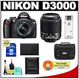 Kit includes:1) Nikon D3000 Digital SLR Camera & 18-55mm G VR DX AF-S Zoom Lens 2) Nikon AF-S 55-200mm f/4-5.6G DX Zoom-NIKKOR Lens3) Transcend 8GB High-Capacity SecureDigital (SDHC) Card4) Spare EN-EL9a High Capacity Lithium-Ion Battery Pack5) Nikon SLR System Case6) Precision Design USB 2.0 High Speed SecureDigital (SD/SDHC) Card Reader 7) Precision Design Memory Card Storage Wallet8) Precision Design Deluxe 6 Piece Lens & Digital SLR Cleaning Kit9) Image Recall Digital Image Recovery SoftwareThe 10.2-megapixel Nikon D3000 Digital SLR Camera enables users to capture stunning images with superior performance. Features include a 3.0-inch monitor, Active D-Lighting, 23 Scene Modes, In-Camera retouch image editing, shooting as fast as 3 FPS, ISO sensitivity from 100 to 1600, built-in sensor cleaning, 11-point AF System and much more.The Nikon 18-55mm VR Lens is an ultra compact, lightweight standard zoom lens that has a 3x focal zoom range. The Vibration Reduction (VR) system allows handheld telephoto zoom shooting even in poorly lit conditions.