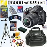A remarkable blend of simplicity and highly-advanced DSLR capabilities, the compact and powerful D5000 offers breathtaking 12.3-megapixel image quality, along with a flexible, Vari-angle, Live View monitor for fresh picture-taking perspectives. Nikon's EXPEED image processing further enhances performance, contributing to split-second shutter response and continuous shooting at up to 4 frames-per-second to capture fast action and precise moments perfectly.The D5000's 24-fps HD D-Movie mode with sound captures video clips with amazing clarity--offering new and exciting creative opportunities. Fast, accurate 11-point autofocus with 3D Tracking, teamed with famous NIKKOR optics, assures incredible image sharpness, while active image sensor cleaning combats annoying dust automatically. Featuring a convenient built-in flash, 19 automatic exposure Scene Modes to make the impossible easy and 23 Custom Setting options to fit your preferences, as well as 14 in-camera image retouching functions, the D5000 is the perfect DSLR, beginning with performance to meet your picture-taking tomorrows.Nikon AF-S DX-Nikkor 18-55mm f3.5-5.6G VR, a lens featuring a built-in Silent Wave Motor and Vibration Reduction (VR). The AF-S DX-Nikkor 18- 55mm f3.5-5.6G VR is an affordable, and compact, 3x zoom lens covering the most frequently used focal range of 18-55mm with amazing versatility.++PLUS++ 8GB Deluxe Accessory Kit: 8 Gigabyte SD Secure Digital Memory Card - Secure Digital USB Card Reader - Universal Memory Card Wallet - Spare EN-EL9 Rechargeable Lithium-ion Replacement Battery Pack - 5pc Deluxe Lens Care & Cleaning Kit - Well Protective SLR Camera Gadget Bag with Pockets & Strap - Package of LCD Screen Protectors - Full Size 59" Tripod W/Case - Jumpstart Guide to Digital SLR Cameras - BONUS!! Free 25 Quality Prints + Free Gift Package, Includes: Resumes & Cover Letter for Dummies, & Neverwinter Nights Kingmaker.